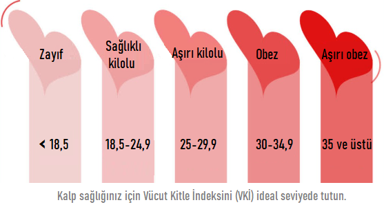 Aşırı kilo ve obezite, yüksek tansiyon, diyabet ve kalp hastalıkları riskini artırmaktadır. Aşırı kilo ve obezite riskini azaltmak için yağ ve şekerden gelen kalorileri sınırlamak, meyve, sebze, tam tahıl ile kuruyemişlerin payını artırmak ve düzenli egzersiz yapmak önemlidir. Haftanın çoğu günü düzenli egzersiz yapmak, sağlıklı bir vücut ağırlığını sürdürmeye yardımcı olmaktadır.