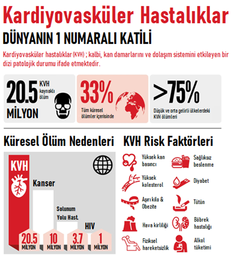 Kardiyovasküler hastalıkların yaklaşık %80’i önlenebilir olmasına rağmen, bu hastalıklar başlıca ölüm nedeni olmaya devam etmekte, her yıl 20 milyon üzerinde kişinin hayat kaybına yol açarak küresel ölümlerin üçte birini oluşturmaktadır.