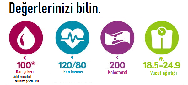 Kolesterol: Kalp sağlığı için belirleyicidir. Total kolesterol 200 mg/dL’nin altında, LDL yani “kötü kolesterol” 100 mg/dL’nin altında, HDL yani “iyi kolesterol” erkeklerde 40 mg/dL, kadınlarda 50 mg/dL ve üzeri olmalıdır. Trigliserid değerinin ise 150 mg/dL’nin altında olması idealdir. Yüksek LDL ve trigliserid damar tıkanıklığına yol açarak kalp krizi ve inme riskini artırırken, yüksek HDL koruyucu etki sağlamaktadır. Sağlıklı beslenme ve gerekirse uygun ilaçlar ile kontrol edilebilir.